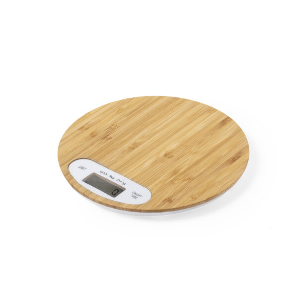 Báscula de cocina de línea nature en bambú pulido. Display digital, con funciones de apagado automático, tara y selección de unidad de pesaje. Alimentación a pilas (de botón incluidas) y peso máximo 5kg. Presentada en atractiva caja de diseño eco.