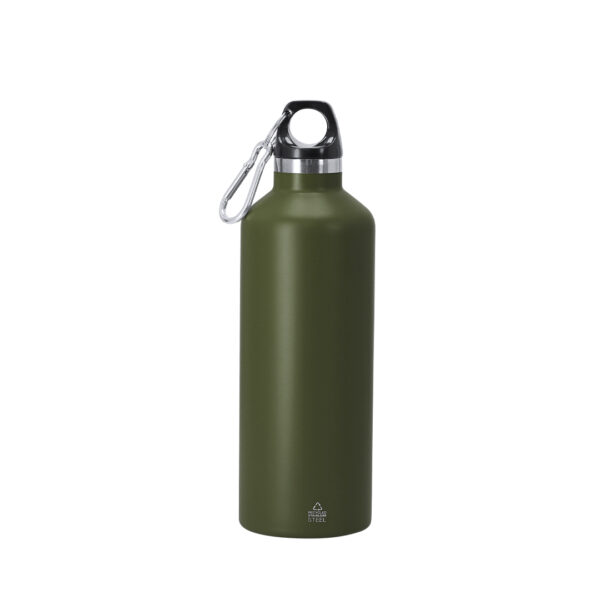 Bidón térmico con 500 ml de capacidad con doble pared en acabado mate. Fabricado en Acero Inoxidable Reciclado con acabado metalizado. Tapón negro de cierre a rosca para garantizar un sellado óptimo. Incluye mosquetón metálico que facilita su transporte. Con distintivo Acero Inoxidable Reciclado.