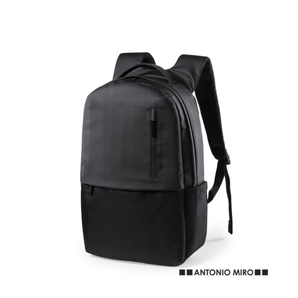 Mochila de Antonio Miró de calidad premium en resistente poliéster 600D de sobrio diseño en color negro. Con cierre de cremallera, bolsillo frontal y asa reforzada metálica. Con acolchado ergonómico en espalda y cintas de hombros, incluye compartimento interior acolchado para portátil de hasta 15 pulgadas y para tablets de hasta 10 pulgadas. Fundas interiores para bolígrafos y smartphone. Con logotipo de la marca en frontal.