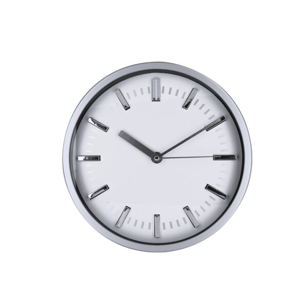 Reloj de pared fabricado con estructura de aluminio y vidrio. La esfera se distingue por marcadores de horas cromados y cuartos en tono plata, ofreciendo un estilo sofisticado y funcional.Alimentación a pilas (1xAA no incluida).