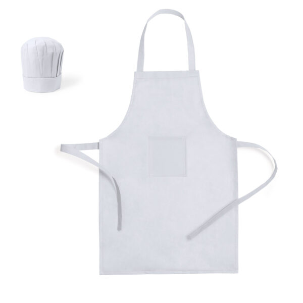 Set infantil de delantal y gorro de cocina en non-woven de vivos colores. Delantal con bolsillo frontal y cintas de ajuste.