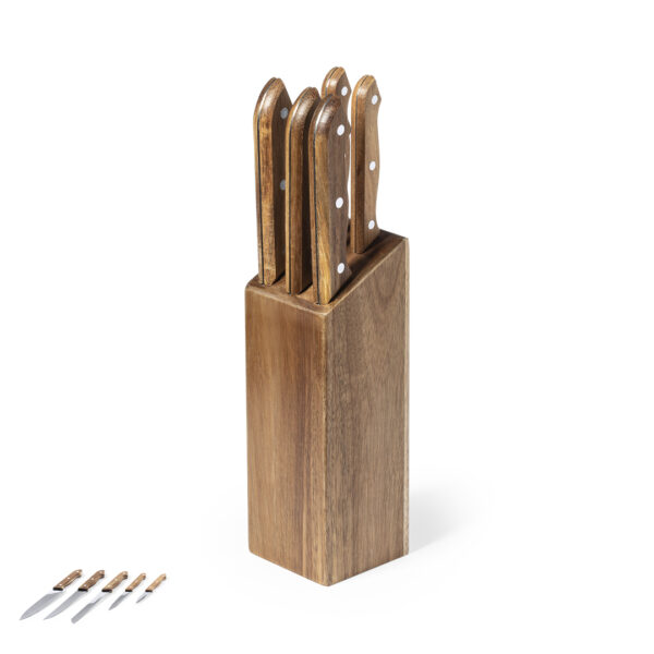 Completo tacoma con base fabricada en resistente madera natural de acacia. Incluye 5 cuchillos en distintos tamaños y para distintos usos, fabricados en acero inox, con mango en madera de acacia. Presentación en caja individual de diseño kraft